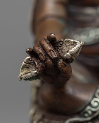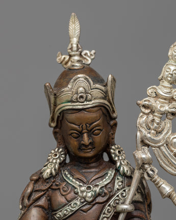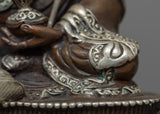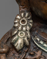 Despite being machine-made, the Guru Rinpoche Statue exemplifies meticulous craftsmanship. The copper body exudes traditional charm, while the silver plating adds a luxurious finish. It represents devotion and spiritual connection, capturing the essence of Guru Rinpoche's sacred presence.