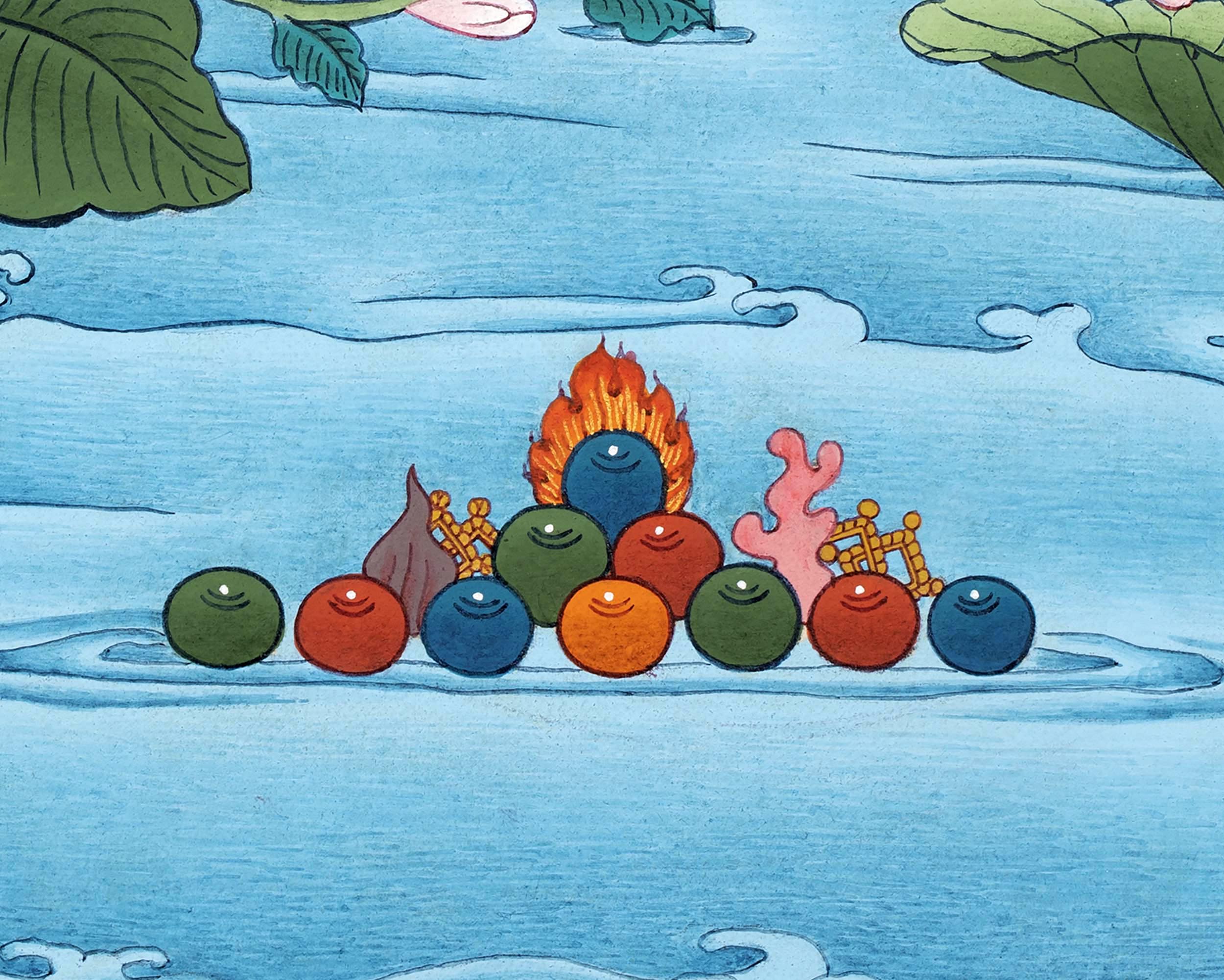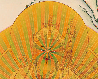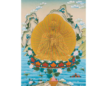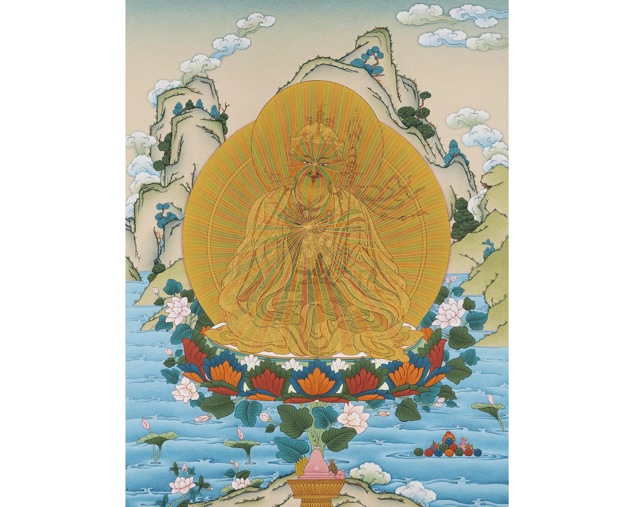 Guru Rinpoche is also known as Padmasambhava. He is captured in his rainbow body form. The Tibetan Buddhist rainbow body is the result of years of specific, disciplined practice with a motive of profound compassion for all beings. The practitioners from the highest lamas to the most humble people have attained rainbow bodies. It is attained by those who perform years and years of meditation practice who have profound compassion for all beings.