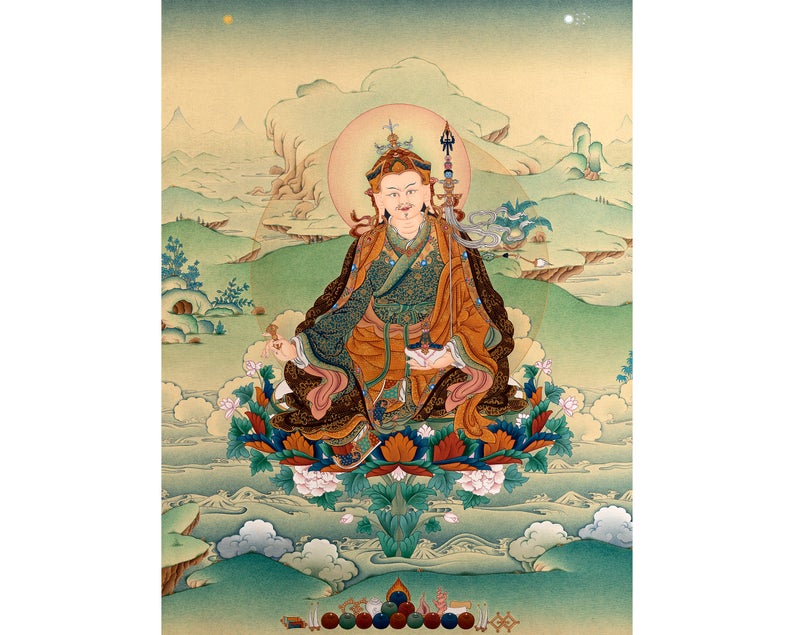 Padmasambhava is high quality thangka. You can see the detailed art lining and goldwork. It will be good to enshrine in your altar. This wonderful Guru thangka is done by one of our senior artists Chitra lama. He has been painting Karma Gadri thangka for more than 12 years now and this thangka is one of his favorite so far. He has meticulously worked on the backgrounds and color palettes to acquire the subtleness which is really helpful for the Practitioners while meditating.This thangka is done following Buddhist text and iconography detail to make sure it presents all the right attributes for your meditation practice.
