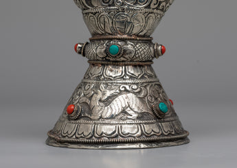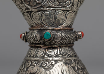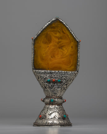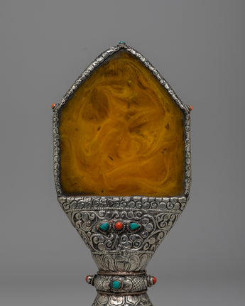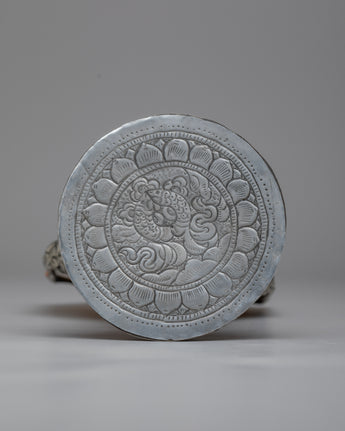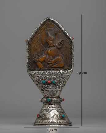 The Guru Rinpoche Stamp, a symbol of spiritual devotion and precise craftsmanship, welcomes you into the world of sacred arts. Handmade on a white metal, this magnificent artwork stands proudly at 29cm and exudes a sense of divine presence. It captures the sense of celestial light and tranquillity by carefully inlaying emitted stones into its surface.