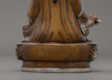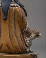 In this statue, we have traditionally sculpted the oxidized copper body of mini Guru Rinpoche by machine. We have elegantly designed the Lotus hat with silver plates and adorned with gemstones. You can use this statue on many Buddhist occasions and during daily meditational activities. We have depicted a deity sitting atop a moon disc lotus seat, holding a vajra in his right hand and a vase in his left hand. This art of Himalayan will be a tremendous gift from Nepal to a practitioner like you.