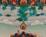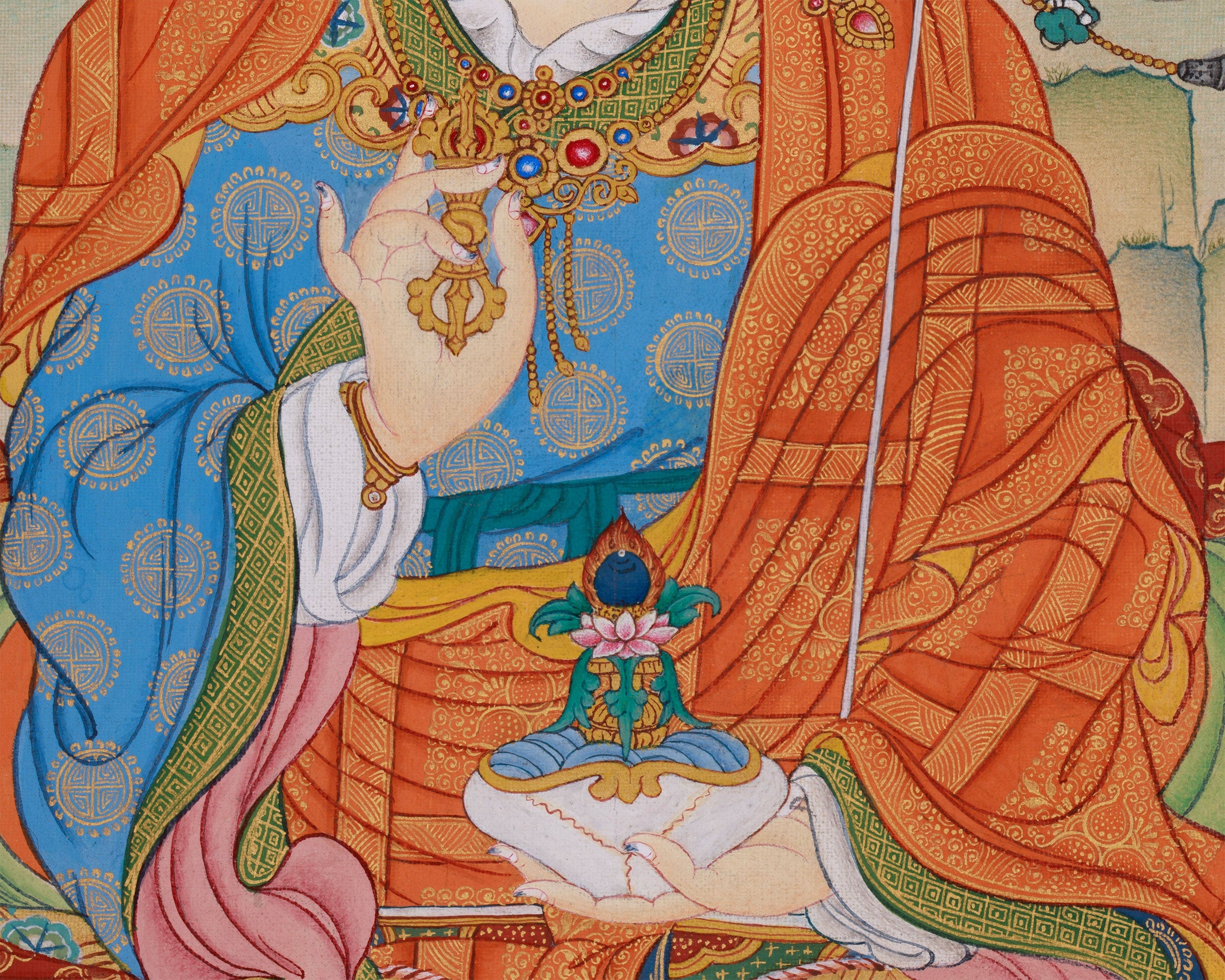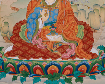 A Karma Gadri style, rooted in the Karma Kagyu tradition, is distinguished by its clean lines, open compositions, and balanced use of color and space. It emphasizes the central figure while subtly incorporating elements of nature, creating a sense of tranquility and spiritual depth. Applied to the depiction of Guru Rinpoche, this style magnifies his enlightened presence while maintaining an aura of serenity and grace.