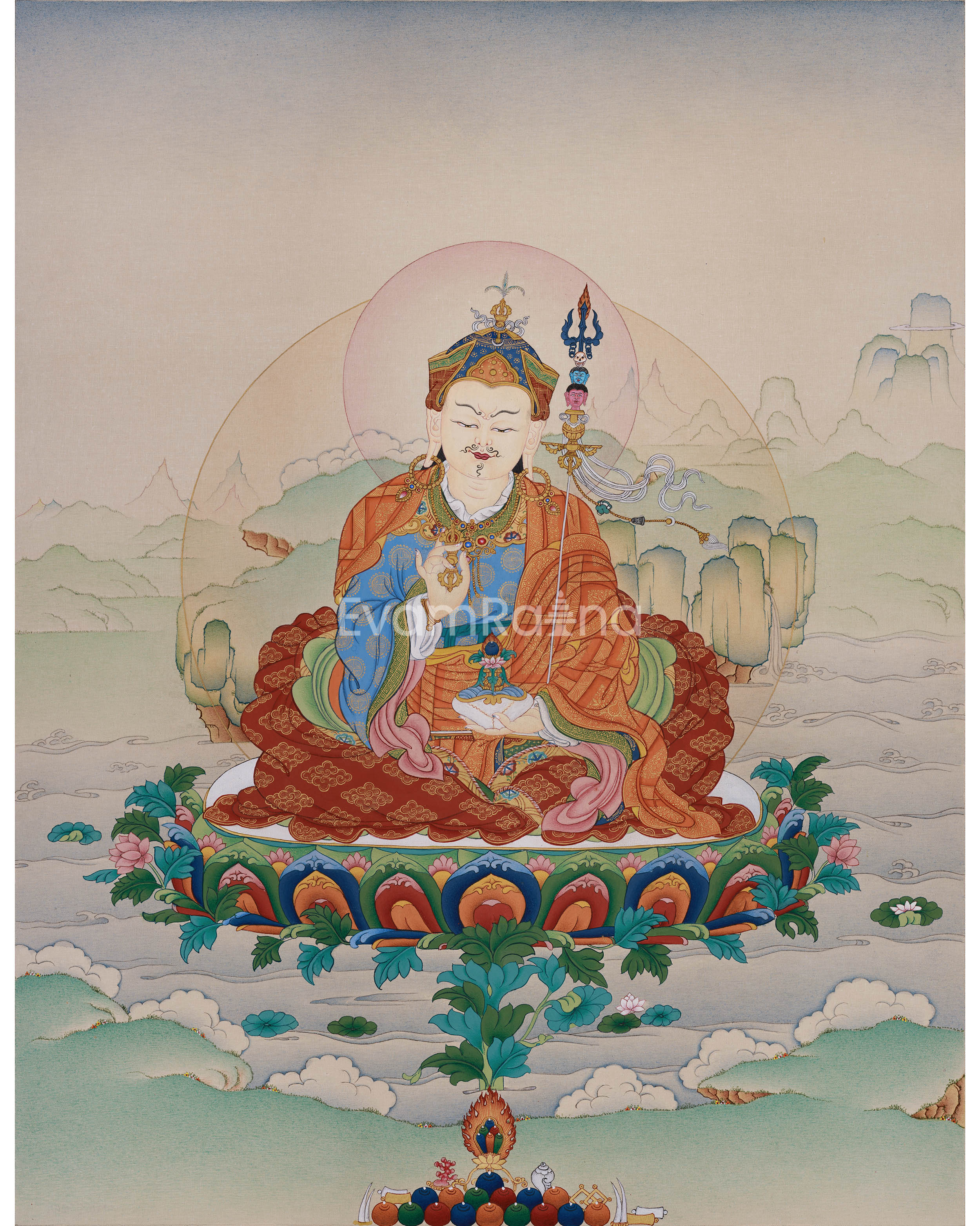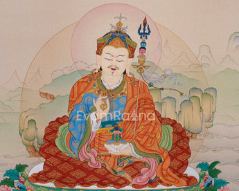 Hand-Painted Guru Rinpoche, The Master of Tantras | Guardian of Wisdom | Seated on Lotus with Serene Mountain Backdrop