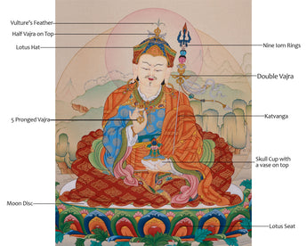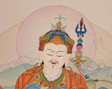 The painting features Guru Rinpoche seated on a lotus throne, symbolizing purity and spiritual elevation. He holds a 5-pronged vajra in his right hand, representing the indestructible nature of reality, and a skull cup topped with a vase in his left hand. His lotus hat, adorned with a vulture's feather, signifies his wisdom. The Katvanga, a ritual staff resting against his shoulder, symbolizes his mastery of tantric practices.