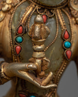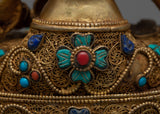 Complete with lavish 24k gold plating made of copper; the statue radiates strength and ageless elegance. Precious coral, lapis lazuli, and turquoise stones are carefully inlaid throughout its elaborate design; each has profound symbolic and spiritual meaning.