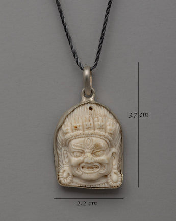 Honor Lord Bhairav's fiery knowledge with this 3.7cm hand-carved locket. This pendant is meticulously made from ethically sourced buffalo bone and framed in white metal, capturing the tremendous presence of Bhairav, a guardian deity in Buddhist and Hindu faiths. The unique design prominently includes Bhairav's iconic five-skull crown, which represents supremacy over the five kleshas (ignorance, attachment, aversion, pride, and jealousy) that prevent spiritual enlightenment. Each skull in the crown symbolizes the transcending of human limitations, guiding the wearer to enlightenment and liberty.