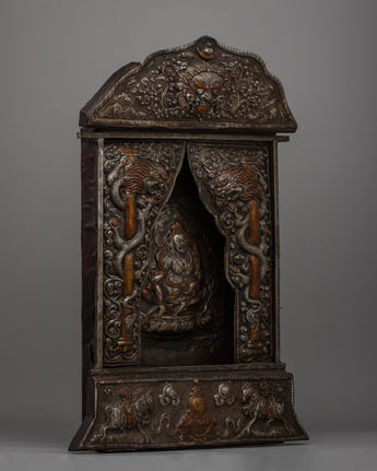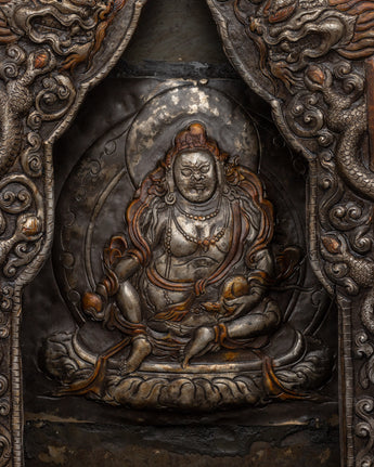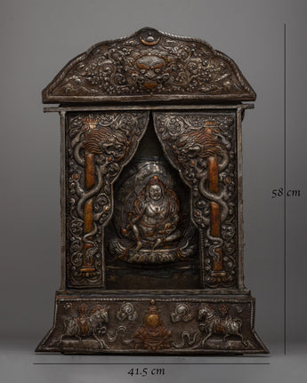 This hand-carved, gold-polished iron wall hanging is a magnificent example of traditional Buddhist art. This metal Thangka, which stands 58 cm tall and 41.5 cm wide and weighs 5.24 kg, is intricately detailed to emphasize its spiritual significance. Metal Thangkas, noted for their durability and timeless beauty, have been a vital part of Tibetan Buddhist traditions for generations. This piece uses the traditional repoussé technique, which creates raised relief designs that add depth and vitality to the rich Buddhist iconography.