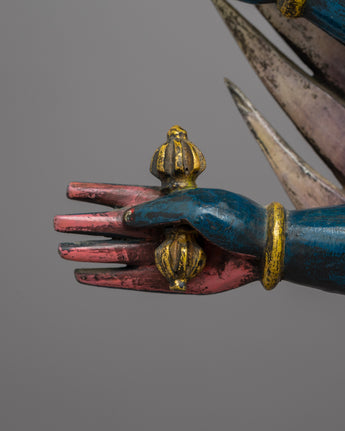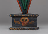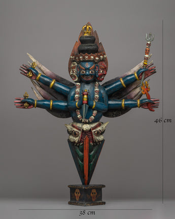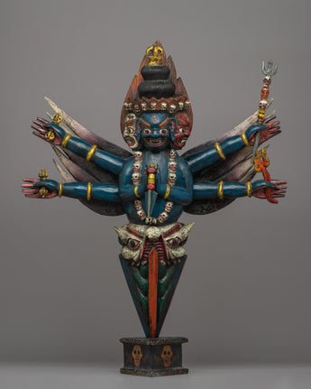 Beautifully handmade in Bhutan, this hand-carved wooden Phurba exhibits spiritual significance and extraordinary skill. The elaborate carving and colorful hand-painted decorations depict a multi-armed deity, symbolizing change and protection in the Tibetan Buddhist tradition. At 46 cm in height and 38 cm in width, this sacred treasure is a great focal point for your shrine or meditation area.