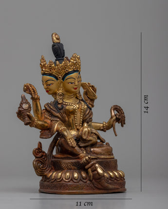 Our Hand-Made Vasudhara Statue is a representation of the Buddhist deity associated with longevity and purification, crafted from copper and partially gilded with 24k gold.