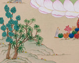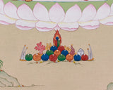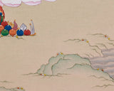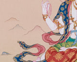 Bodhisattva Chenrezig artwork is meticulously hand-painted on high-quality cotton canvas and embellished with 24K gold. Created with precision, it embodies Chenrezig, the embodiment of boundless loving-kindness. The natural colors give the composition a soft, timeless depth, while the gold detailing highlights his sacred ornaments and crown. Created in the elegant Karma Gadri style, it exemplifies a visual tradition rooted in clarity, harmony, and spaciousness.