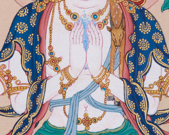 The sacred painting depicts Bodhisattva Chenrezig, seated in vajra posture on a moon disc, symbolizing purity and untouched by worldly defilements. His hands are joined in an anjali mudra, holding a wish-fulfilling crystal, a crystal rosary, and a long-stemmed blue utpala lotus. Chenrezig is adorned with a five-jeweled crown, representing the mastery of the five wisdoms of the Buddha. Flowing silk scarves and intricate ornaments signify his enlightened attributes and compassionate activities across all realms. A deer skin, a traditional symbol of gentleness and non-harming, is draped over one shoulder.