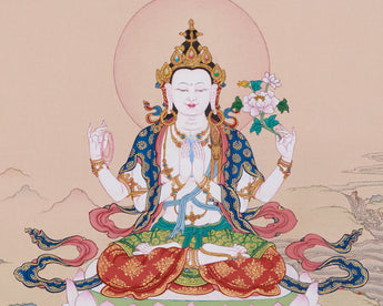 A luminous halo surrounds his serene face, radiating the inner light of an awakened mind. His calm and benevolent gaze looks upon all beings with limitless empathy, ready to respond to their suffering. The painting conveys the profound message of Chenrezig's eternal vow to remain in the cycle of existence until every being attains liberation.