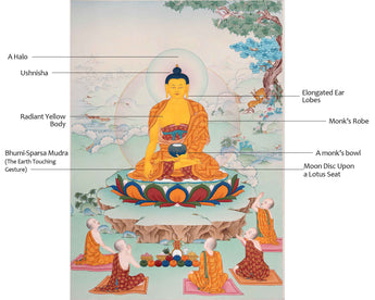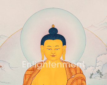 Discover peace with Buddha Shakyamuni thangka, exquisitely hand-painted with natural stone colors on cotton canvas. This work of art captures the gentle essence of Gautama Buddha in the Bhumiparsham mudra and symbolizes his enlightenment. This Thangka radiates Shakyamuni Buddha's deep wisdom and compassion that provides a spiritual connection to the Buddha's teachings.