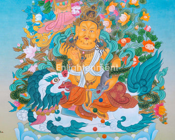 Jambhala, also known as Namtose or Namtose Hayagriva, is a revered wealth deity in various Buddhist traditions, particularly within Tibetan Buddhism. Depicted with a fierce countenance, Jambhala is associated with the protection of wealth and the bestowal of prosperity and abundance upon devotees. As a Bodhisattva embodying the enlightened qualities of compassion, wisdom, and power, Jambhala is often depicted holding a mongoose spouting jewels, symbolizing the endless treasure of spiritual wealth. Devotees turn to Jambhala in their pursuit of material well-being and financial stability, seeking not just material riches but also the spiritual virtues that lead to a fulfilling life. The practice of invoking Jambhala is believed to clear obstacles and create favorable conditions for prosperity, making thangka art featuring this wealth deity a potent visual aid in meditation and prayer for abundance and success.