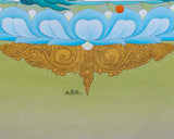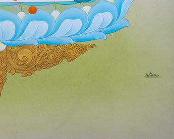 The Namtoshe Thangka, a masterpiece meticulously hand-painted on a premium cotton canvas, exemplifies a harmonious blend of artistic finesse and spiritual symbolism. Crafted with acrylic paint, this exquisite piece showcases the intricate details of the Namtoshe, capturing the essence of its divine significance. The vibrant hues and meticulous strokes bring the sacred imagery to life, creating a visual feast for the senses. What sets this thangka apart is the application of genuine 24K gold, adding a touch of opulence that symbolizes the divine radiance associated with the spiritual subject. The use of gold leaf enhances the sacred elements of the artwork, creating a luminous and ethereal quality. Displaying the Namtoshe Thangka not only graces your space with aesthetic beauty but also invites a spiritual connection, as each stroke of the brush and gleam of gold reflects a deep reverence for the sacred symbolism embodied in this divine representation.