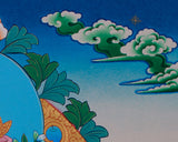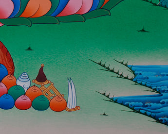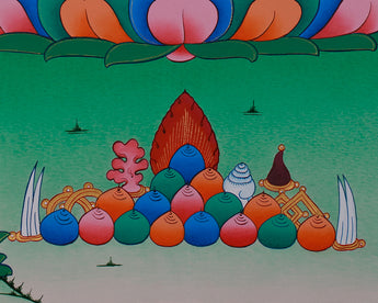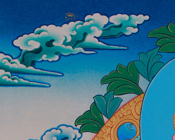 His serene and tranquil demeanor embodies his role as a compassionate guide. The lotus seat underneath him represents spiritual purity and awakening, while his luminous aura, framed by a blue halo, highlights his enlightened essence. The background of the Thangka further accentuates his compassion. The enchanting scenery features snow-covered mountains and a waterfall amid breathtaking landscapes. This Thangka promotes inner peace, enlightenment, and a profound connection to the universe, whether you aim to elevate your meditation practice or enrich your home with a meaningful spiritual symbol.
