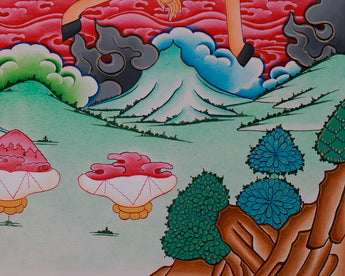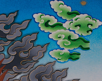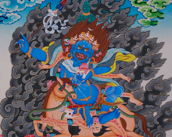 Palden Lhamo, a fierce goddess representing the elimination of harmful influences and barriers on the journey to enlightenment. She rides a mule across a sea of blood, embodied by her flaming hair, a garland of severed heads, and a skull cup filled with blood. The artwork features a striking smokey background with sacred golden highlights that amplify its sacred essence. Designed as a spiritual aid, it supports meditation, rituals, and blessings, acting as a Dharma protector for residences, temples, and monasteries. Whether placed in a meditation area or presented as a gift to practitioners, this hand-painted thangka provides divine wisdom, guidance, and compassion to those who revere it.