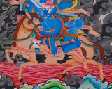 Goddess Palden Lhamo Thangka, a hand-painted piece featuring the respected Tibetan Buddhist guardian deity. Created on cotton canvas with acrylics and 24K gold, it reflects the deity's fierce yet compassionate essence, acting as both a meditative tool and a formidable protector for spiritual practitioners.
