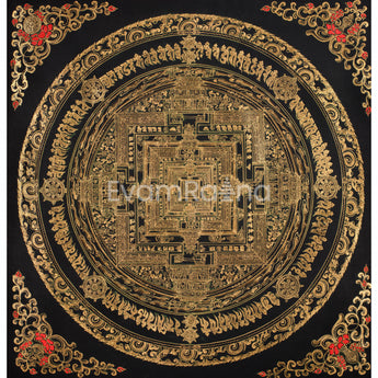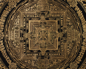Kalachakra Mandala, also known as the "Wheel of Time," is a significant symbol in Tibetan Buddhism, representing cosmic order, interconnectedness, and the path to enlightenment. Its center features the Kalachakra deity's palace, symbolizing wisdom and compassion, surrounded by concentric circles and squares. This meditation tool and emblem of universal harmony are perfect for display in meditation rooms, altars, or living spaces, with its black-and-gold aesthetic adding a modern touch.