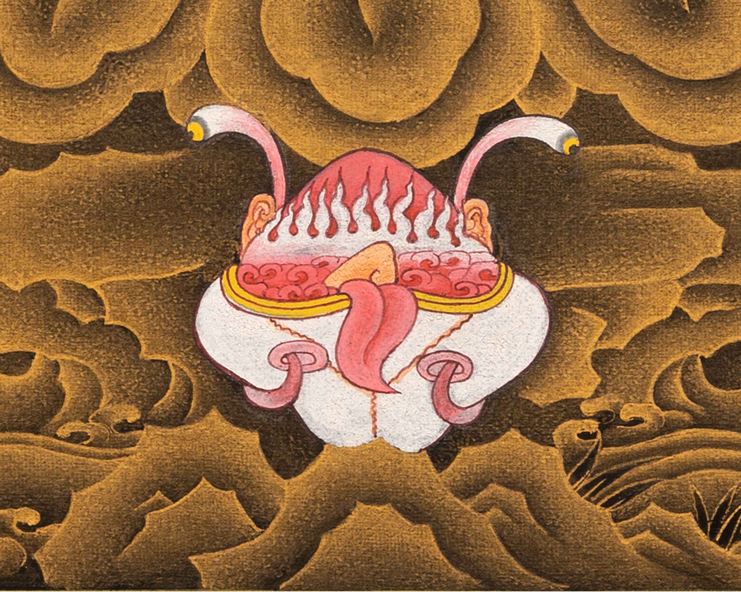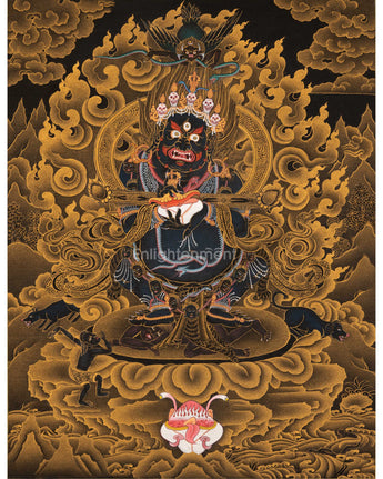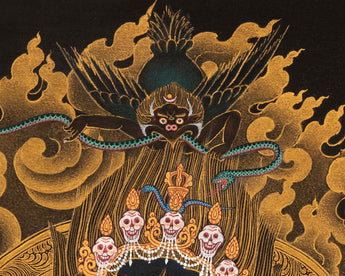 Black and Gold thangkas have quite an interesting origin story. It is believed that the remains of a holy lama were applied to a canvas, and later, a deity was drawn upon it with gold. There is also a strong faith that using gold in thangkas helps accumulate merits. As a guardian(Dharmapala), Mahakala guards the teachings of the Dharma, particularly in relation to the Hevajra Tantra, the Vajra Panjara tantra, and the Paramasuka Chakrasamvara tantra. He typically serves advanced Buddhist practitioners, often known as tantric practitioners or adepts, in their quest for enlightenment. This Mahakala thangka will be an ideal gift for practitioners!