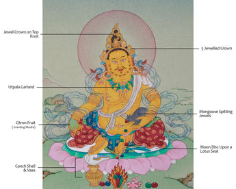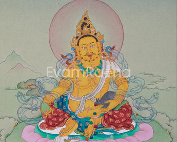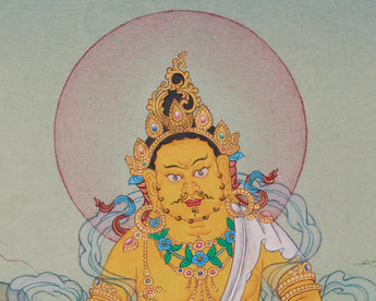 Kuber, the god of wealth and prosperity, is also revered in Tibetan Buddhism as a protector deity associated with abundance and material well-being. In thangka, Kuber is depicted as a joyful and prosperous figure, symbolizing both material wealth and spiritual richness. He is depicted holding a citron fruit, a symbol of good fortune, and a mongoose spitting jewels, symbolizing the endless flow of prosperity. Kuber's lavish attire, adorned with jewels and gold, serves as a reminder of the balance between material wealth and spiritual practice, encouraging generosity and mindful pursuit of prosperity.