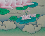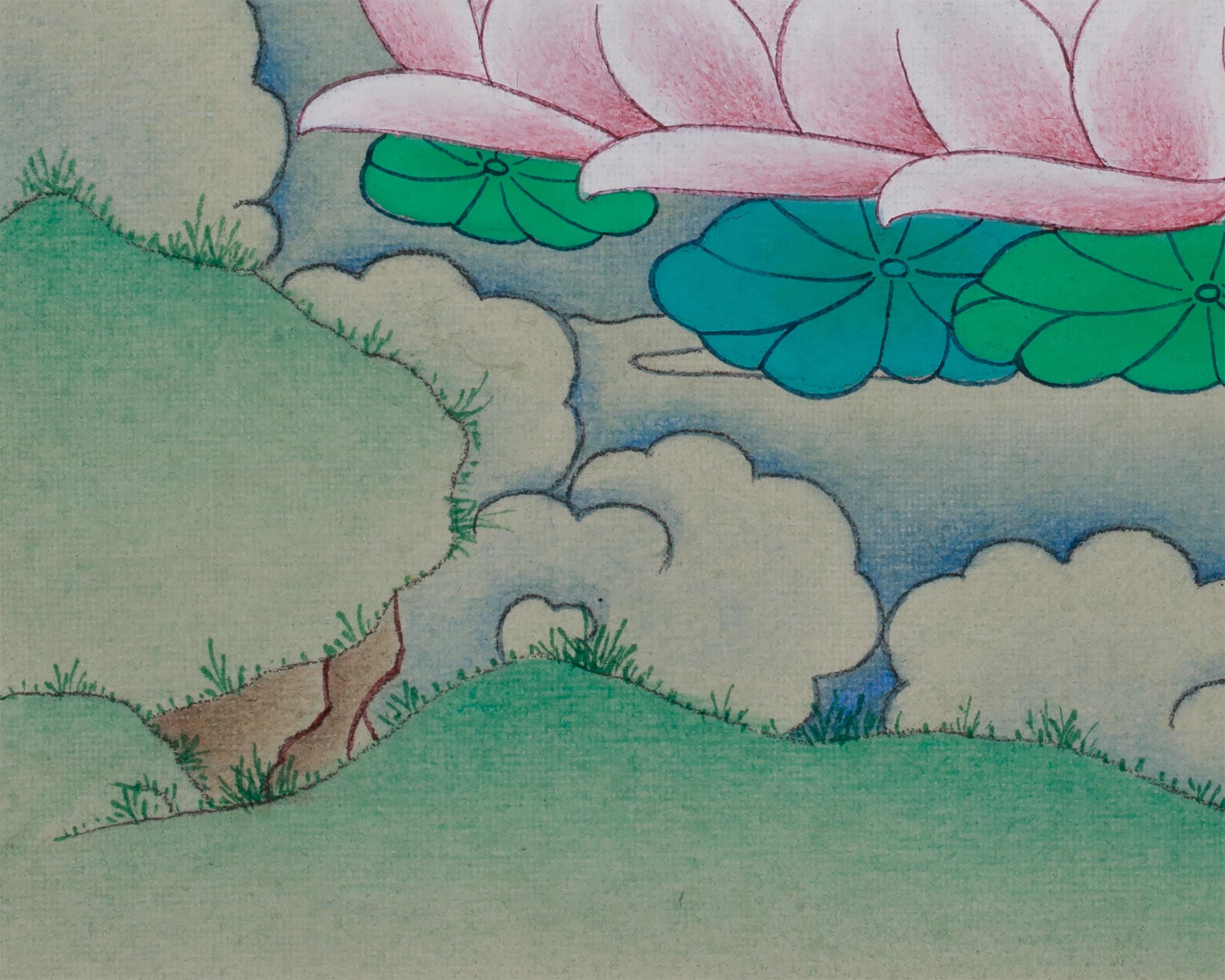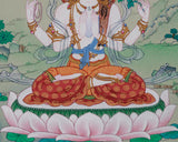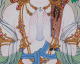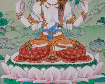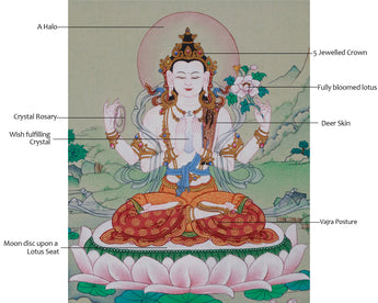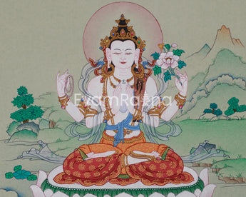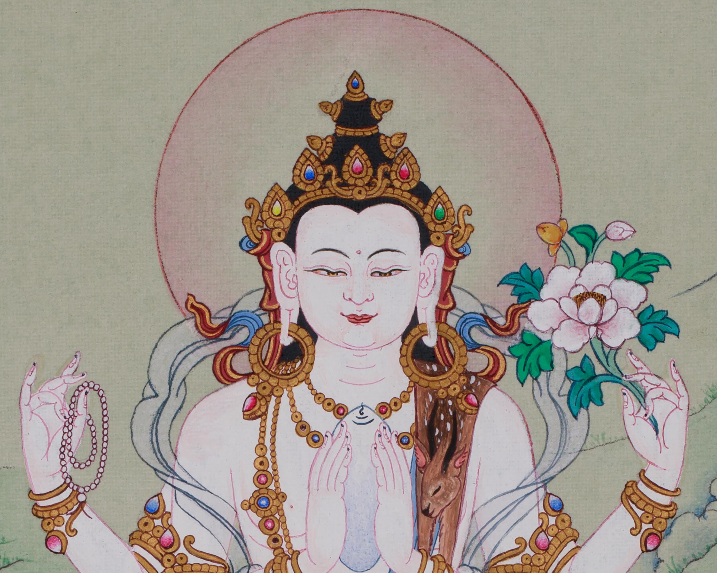 This sacred painting depicts Chenrezig, seated in vajra posture on a moon disc, symbolizing purity. His hands are joined in an anjali mudra, holding a wish-fulfilling crystal, a crystal rosary, and a blue utpala lotus. He is adorned with a five-jeweled crown, representing the mastery of the five wisdoms of the Buddha. Flowing silk scarves and intricate ornaments signify his enlightened attributes and compassionate activities across all realms. The deerskin, a traditional symbol of gentleness and non-harming, is draped on his left shoulder. A halo surrounds his serene face, radiating the inner light of an awakened mind. His calm and benevolent gaze looks upon all beings with limitless empathy, ready to respond to their suffering.