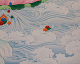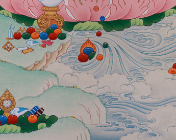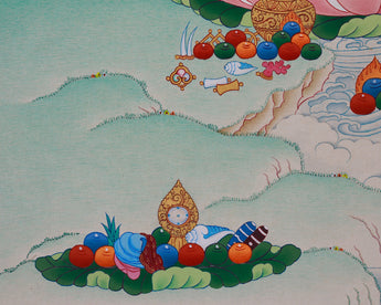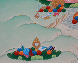 The backdrop showcases a high-altitude scene filled with vibrant flora, flowing water, and swirling clouds, illustrating the abundance and vitality that Dzambhala embodies. The water signifies the universe's relentless flow of prosperity and benefits. Below him, neatly arranged sacred offerings, mirror the traditional gifts intended to receive his blessings. Beyond its advantages, this esteemed Dzambhala thangka is also an exquisite piece of art that fosters compassion and personal growth.
