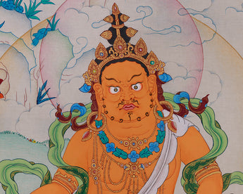 This hand-painted Yellow Jambhala thangka symbolizes the deity of prosperity and success, associated with material and spiritual wealth. He majestically sits on a lotus seat upon a moon disc, representing purity and enlightenment linked with wealth. His firm, golden figure embodies prosperity and power. Painted on cotton canvas with natural stone colors, this artwork reflects the traditional Karma Gadri style. The inclusion of pure 24K gold enhances the deity's brilliance, signifying his spiritual strength.