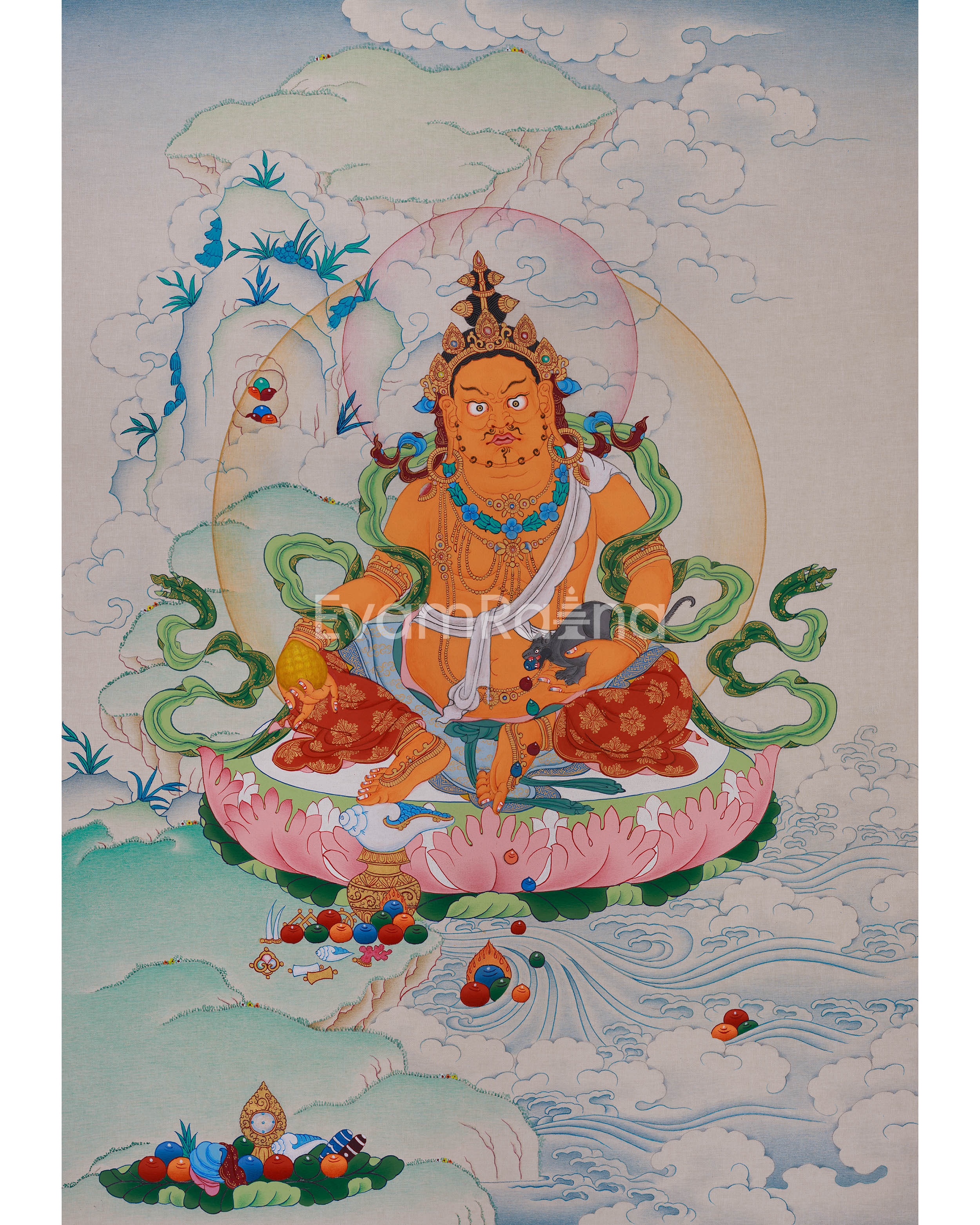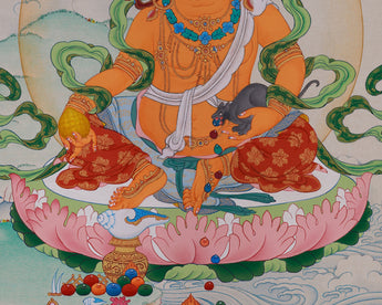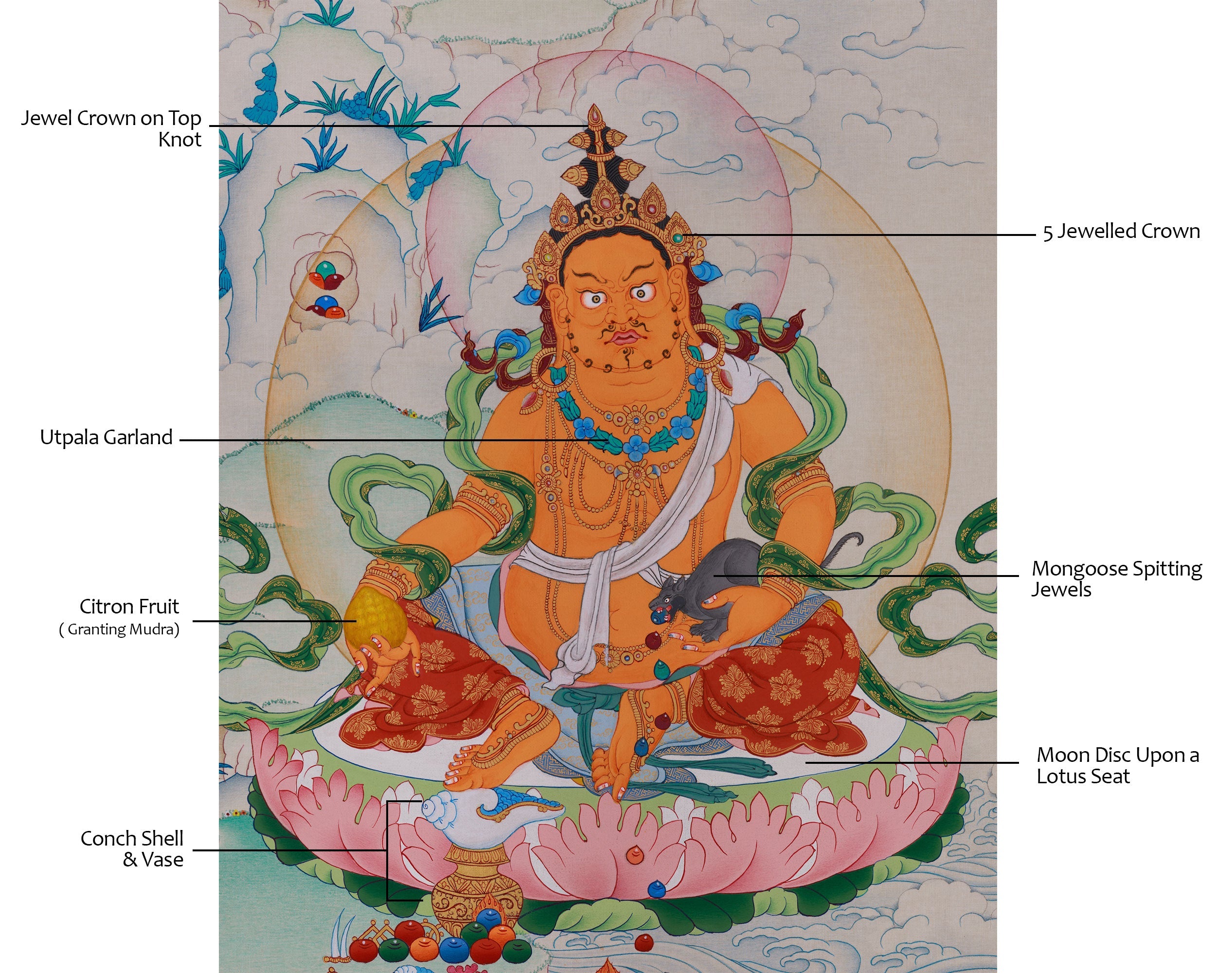 He dons a crown embellished with jewels atop his topknot, representing his elevated status as a prosperous deity, alongside another crown featuring five jewels that symbolize the five wisdoms of an enlightened mind. His figure is draped in luxurious silk garments and adorned with a utpala garland, emphasizing his nature as a deity who bestows wealth. He holds a citron fruit for fortune in his right while his left-hand grips a mongoose that spits jewels, symbolizing endless riches.