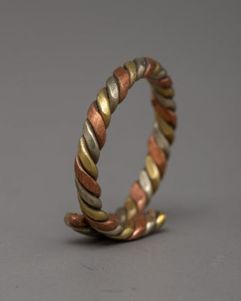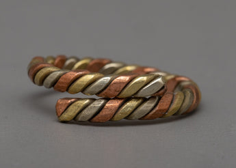 The Hand Twisted Ring combines the warm tones of copper, the richness of brass, and the sleekness of white metal, creating a captivating fusion of colors and textures. Its adjustable design ensures a comfortable fit for fingers of all sizes, making it an adaptable addition to any jewelry collection.