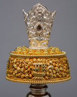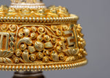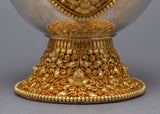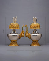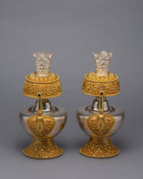 These two matching ritual vases are made of sliver and 24K gold with fine hand carvings. The spouts, bases, and covers are beautifully hand carved with designs of flowers and other Buddhist symbols. The vases are identical except for the sacred syllables and other symbols inscribed around their rims.