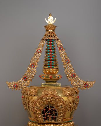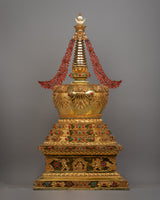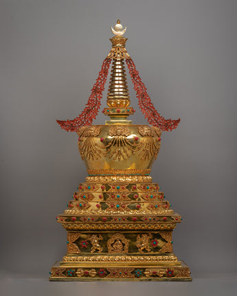 This Stupa is handcrafted with unique details and plated with gold for Nourishment and Restraint in your life.