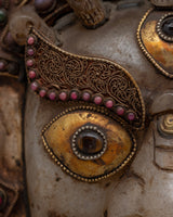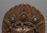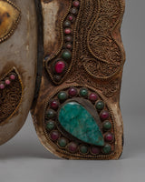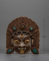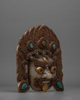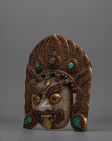 The Handcrafted Mahakala Mask is a stunning representation of the imposing Tibetan Buddhist protector god Mahakala, who is adored for his strong and protecting force. This gorgeous mask is expertly made from a copper body then electro gold-plated to provide an exquisite finish. The overall mask consists mainly of crystal, with some pieces beautifully coated in copper, blending spiritual meaning with artistic brilliance. The mask, adorned with artificial stones such as turquoise and Jarkin, symbolizes divine protection and wealth. Each minute detail, from the enormous third eye on Mahakala's forehead to the furious, extended tongue, reveals his wrathful appearance, embodying his duty as barrier remover and Dharma protector.