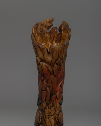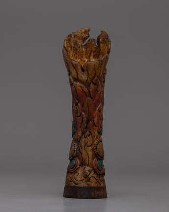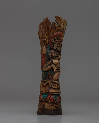 This handcrafted Mahakala Protector statue, measuring 18.5cm tall and 5.5cm wide, is an excellent depiction of the respected guardian deity of Tibetan and Mahayana Buddhism. This statue, made from ethically obtained bone and decorated with intricate Art, depicts Mahakala in his famous form, wearing a crown of five skulls that represents the transformation of the five kleshas (bad emotions) into the five pearls of wisdom.