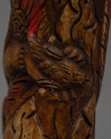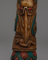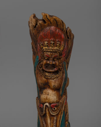 This delicately carved Mahakala statue, measuring 19.5cm tall and 5cm wide, powerfully portrays the guardian deity venerated in Mahayana and Tibetan Buddhism. Mahakala is revered as the defender of Buddhist teachings, personifying wisdom and transforming negative energy into enlightened awareness. Crafted from ethically obtained bone, this unique sculpture features the deity's famous crown of five skulls, which represents the transformation of the five kleshas (bad emotions) into the five pearls of wisdom.