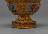 Exquisite filigree work and imitation stones, including coral and turquoise, further enhance the bowl, providing an energetic and significant touch. These components come together to create a work that has deep spiritual meaning in addition to being exquisite to look at. This Ritual Offering Bowl, which weighs 1.008 kg, is a big and significant addition to any holy place. It can be used for ceremonies or as an ornamental item that honors the rich cultural legacy of Tibetan handicrafts.