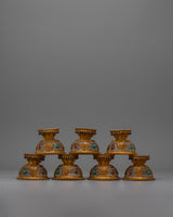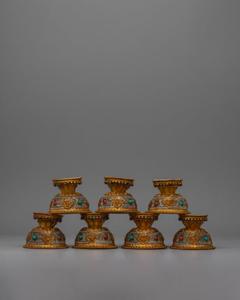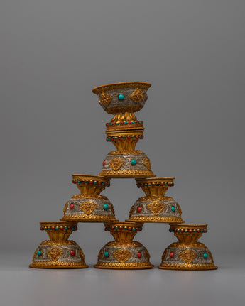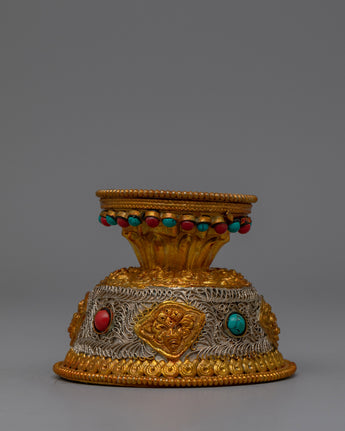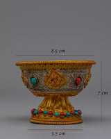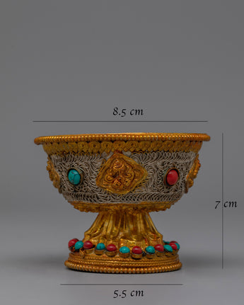Introducing this Ritual Offering Bowl, an exquisitely created item that perfectly captures the spirit of traditional Tibetan art and spiritual offerings. This bowl has a bright and durable appearance since it is made of a copper body that is elegantly plated in silver and gold. The bowl is ideal for holding offerings, standing 7 cm tall with an 8.5 cm diameter and an interior depth of 4 cm. This exquisitely designed vase has a powerful 5.5-centimeter base that can support it.