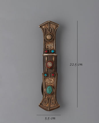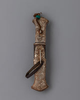 This elegant Sacred Buddhist Knife, which is made of white metal and adorned with artificial turquoise and coral stones, is an exquisite spiritual implement with deep roots in Buddhist customs. Its dimensions are 22.5 cm in height by 5.5 cm in breadth and 0.23 kilogram in weight. Its symbolic meaning is the breaking through ignorance and impediments on the way to enlightenment. Both its artistic beauty and ritual significance are reflected in the meticulous craftsmanship.