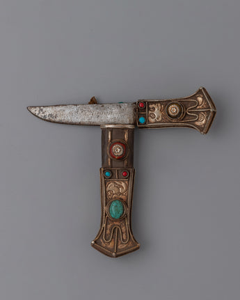In Tibetan traditions, a Tibetan knife, also called a "phurba" or "kila," has cultural and symbolic meaning. The unique three-sided blade of this ceremonial dagger represents the victory over ignorance, desire, and aversion in Buddhism. Tibetan knives, which are adorned with elaborate carvings and frequently have a tripartite handle that represents different gods, are an essential part of religious rites, ceremonies, and spiritual practices. In addition to their spiritual significance, these knives might have practical uses in daily life, exhibiting in Tibetan communities a combination of deep cultural symbolism and usefulness.