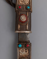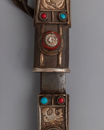 The energetic colors of coral and turquoise, which are frequently connected to healing and protection in Tibetan Buddhism, perfectly complement the knife's intricate workmanship. This holy knife is a valuable addition to any collection and holds significance for both collectors and practitioners, whether it is utilized in rituals or placed in a spiritual area as a symbolic object.