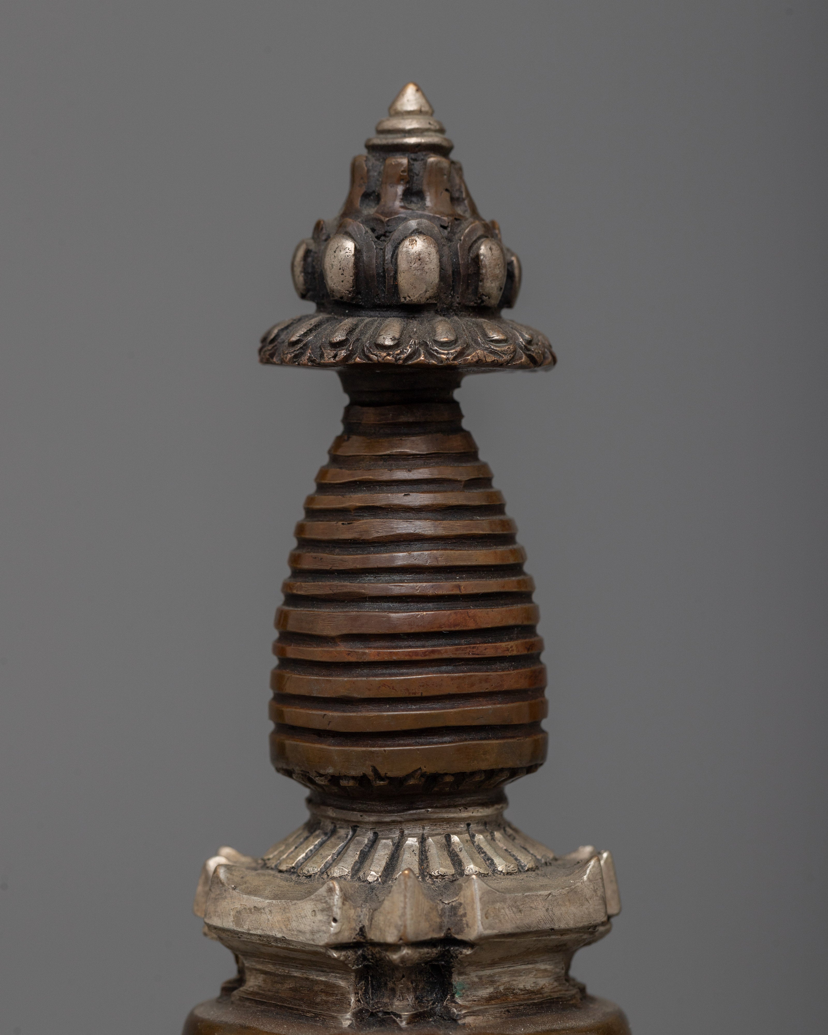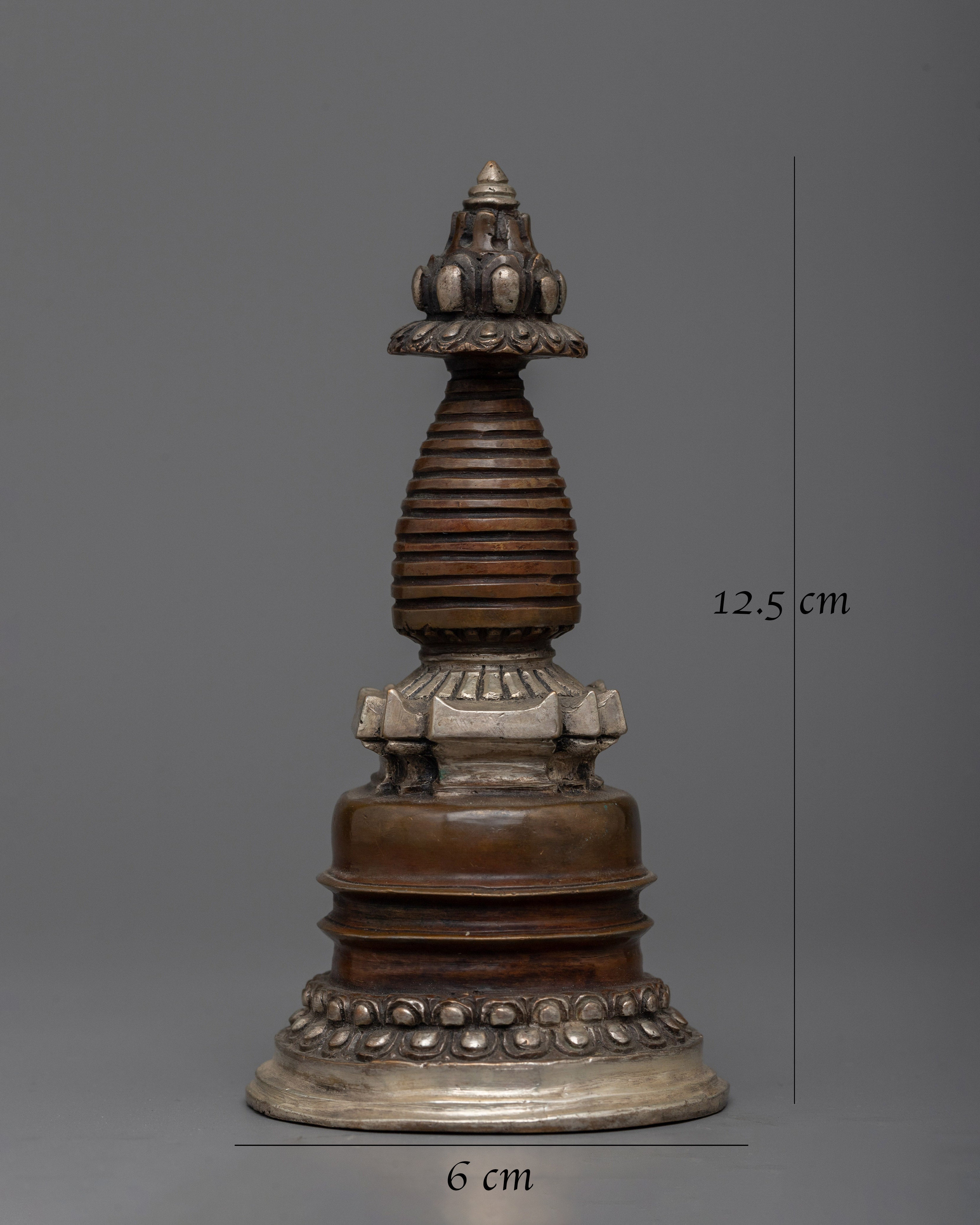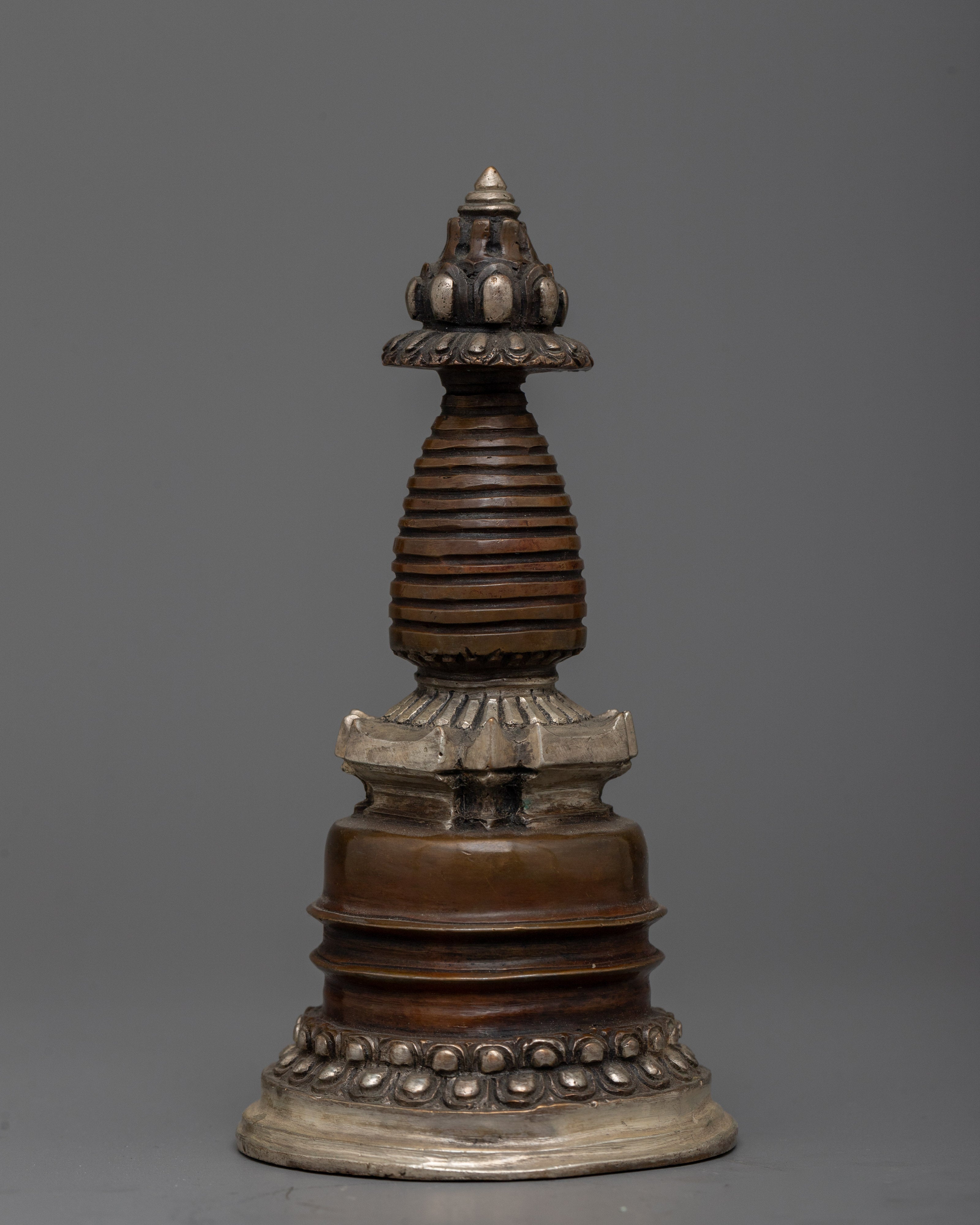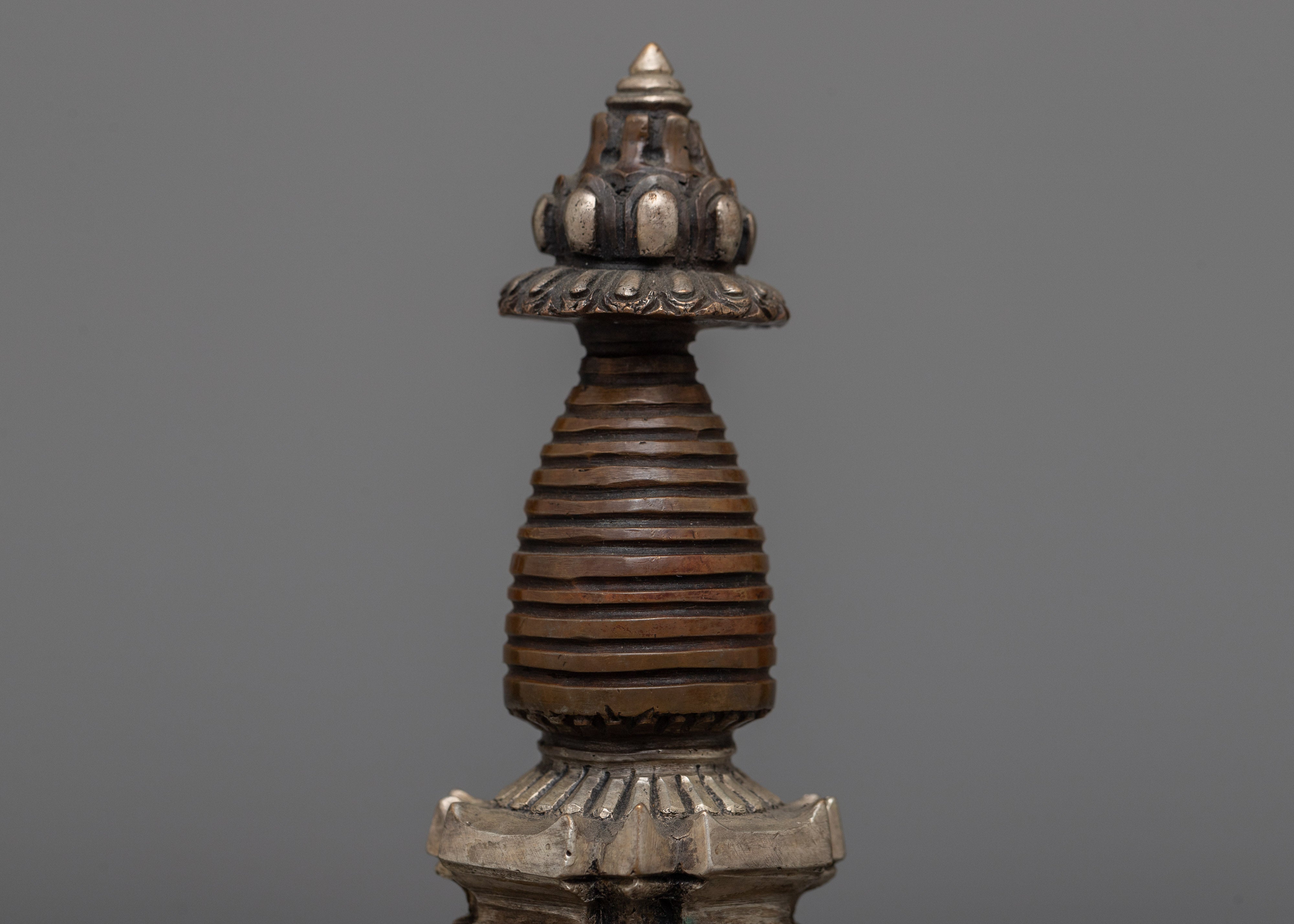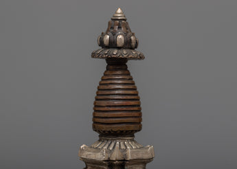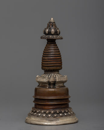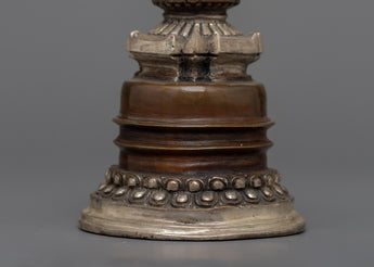 Discover the magnificent Handcrafted Stupa Statue, which was expertly carved from oxidized Copper and elegantly plated in silver. With its exquisite craftsmanship and graceful form, this 12.5-cm-tall stupa embodies the classic Buddhist symbolism of enlightenment. The statue's delicate architectural elements are highlighted by the deep, rich texture of the oxidized Copper body, which contrasts brilliantly with the bright, shiny silver finish.