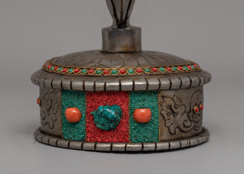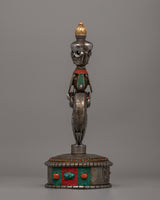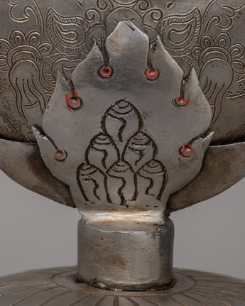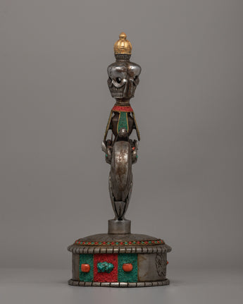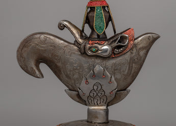 The handcrafted Tibetan Kartika Knife, also known as the "Ritual Crescent Knife," is a sacred implement in Tibetan Buddhism that represents the elimination of attachments and ignorance. This elaborately constructed piece, made of iron, is an important artifact used in Buddhist rituals and meditation. The triangular blade, which frequently represents the removal of obstacles, is adorned with exquisite details, highlighting Tibet's rich legacy of craftsmanship.