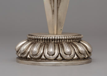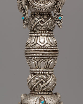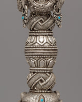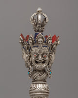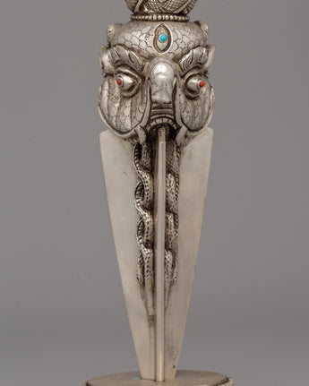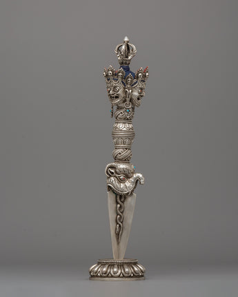This Tibetan Ritual Phurba Dagger is a remarkable example of holy craftsmanship, with a copper body coated with 5 microns of silver for a dazzling and long-lasting finish. The Phurba, traditionally employed in Tibetan Buddhist ceremonies, represents the transmutation of negative energy and is an effective tool for spiritual rites. The complex design, which includes legendary themes and symbolic engravings, emphasizes this spiritual relic's creativity and cultural value.