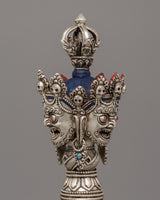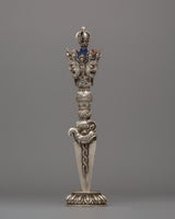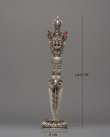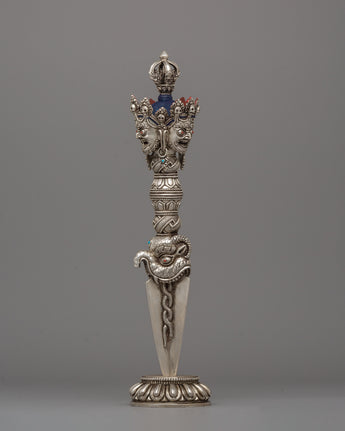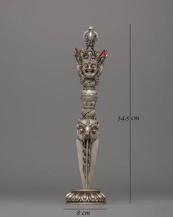 Standing 34.5 cm tall, 8 cm wide, and weighing 2.24 kg, this Phurba is both a beautiful ornamental piece and a profound ceremonial object. Whether put on an altar or displayed as a collectible, it exudes mystique and devotion. This handcrafted Phurba is an excellent gift for practitioners, collectors, or anybody who appreciates holy Tibetan art.