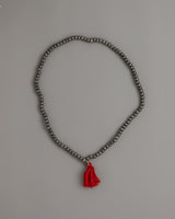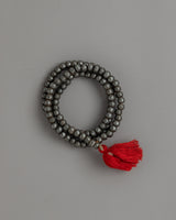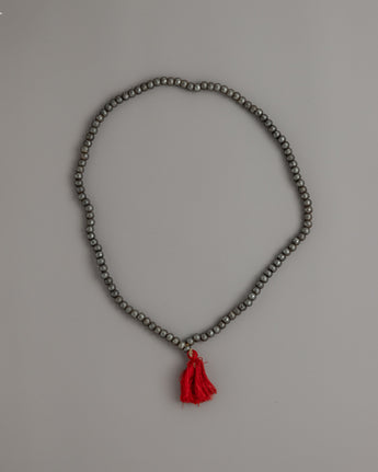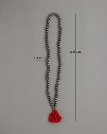 The mala is finished with a striking red tassel at the end, which adds a bright contrast to the otherwise muted tones of the iron beads. This tassel, commonly found on malas, represents a connection to the divine and the completion of a cycle, emphasizing the piece's spiritual significance. The delicately knotted tassel hangs gracefully, adding movement and flow to the mala's otherwise structured design.