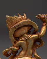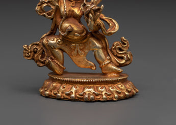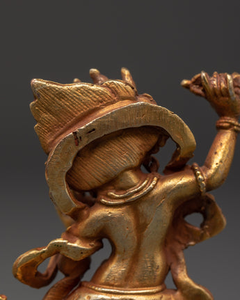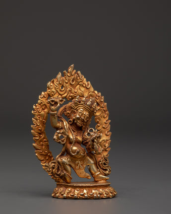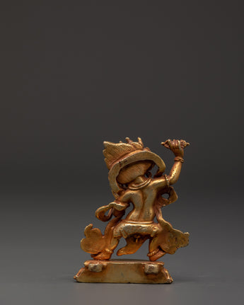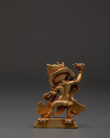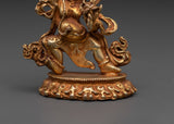 This handmade statue of Vajrapani measures 9cm in height by 6.5cm in width and features a copper body with gold plating. At 0.13kg, this representation of Buddhism's foremost protector deity exhibits artisanal quality. The statue's proportions and materials adhere to traditional iconographic specifications, making it an authentic devotional object for practitioners seeking a connection to Vajrapani's protective energies and preserving dharmic teachings.