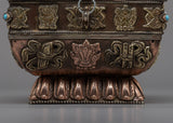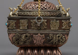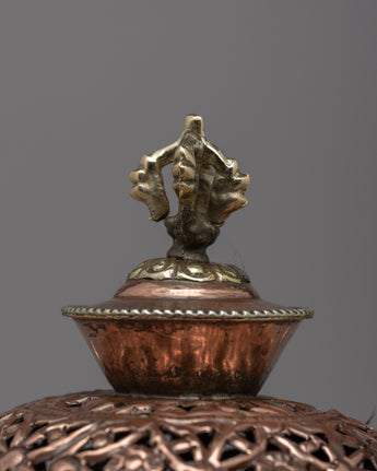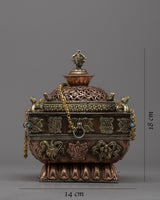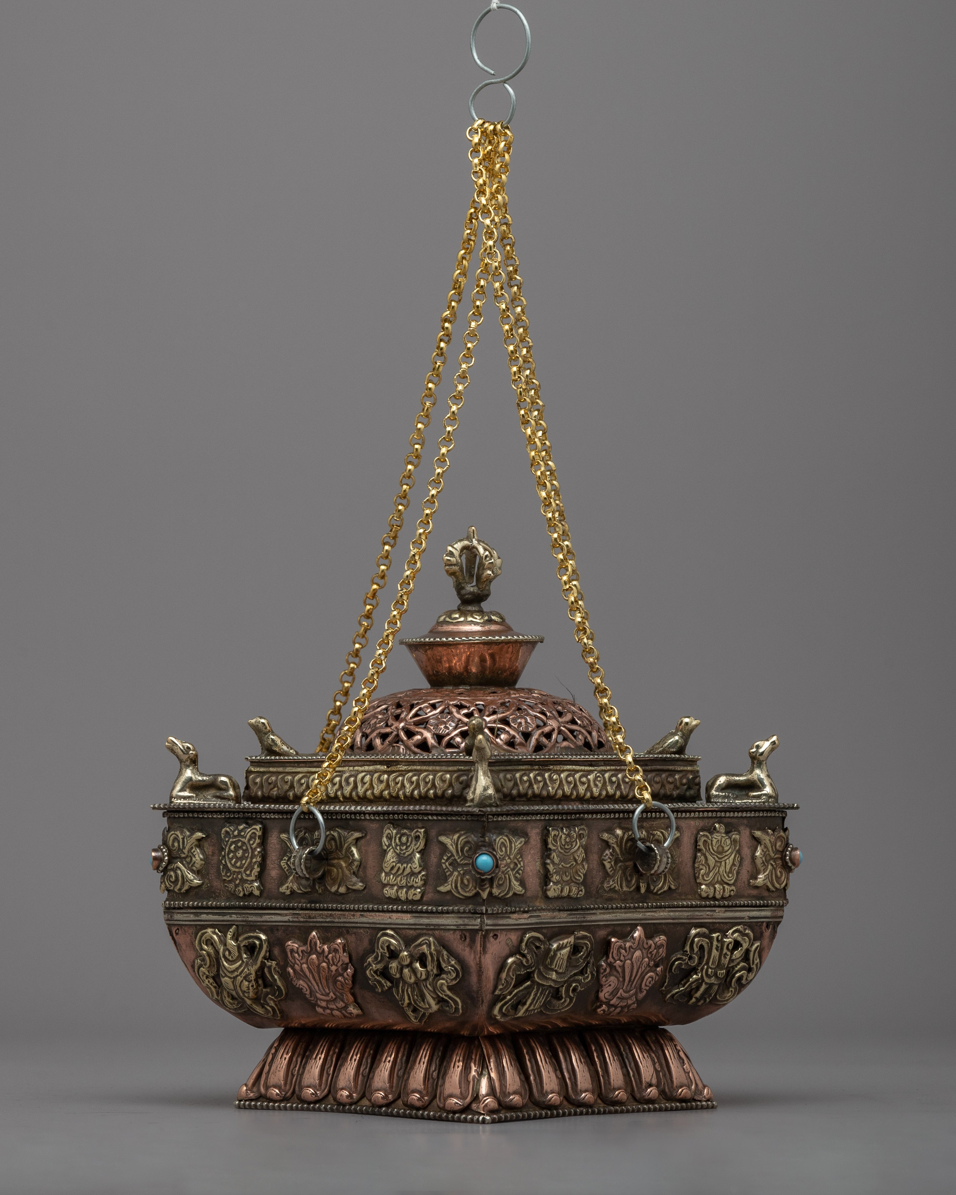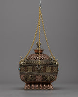The Hanging Incense Burner is a stunning creation handcrafted from brass and copper, resulting in a harmonious blend of materials that evoke a sense of reverence and beauty. Standing at a height of 18cm, this exquisite piece is not only a functional incense burner but also a work of art that adds an aura of sacredness to any space. The intricate detailing and craftsmanship on the burner's surface reflect the devotion and care that went into its creation. Its suspended design allows for easy hanging, making it a versatile addition to meditation spaces, prayer corners, or any area where a tranquil ambiance is sought. As incense is lit within, the fragrant plumes rise, carrying one's intentions and prayers aloft, creating a moment of connection to the spiritual and the transcendent. This Hanging Incense Burner serves as a reminder of the beauty that can arise from the convergence of artistry and spirituality, inviting you to embrace the meditative moments it inspires.