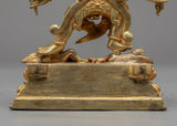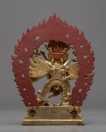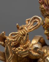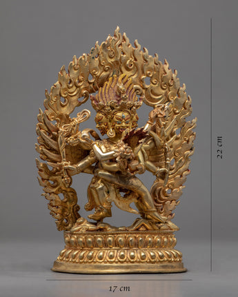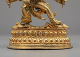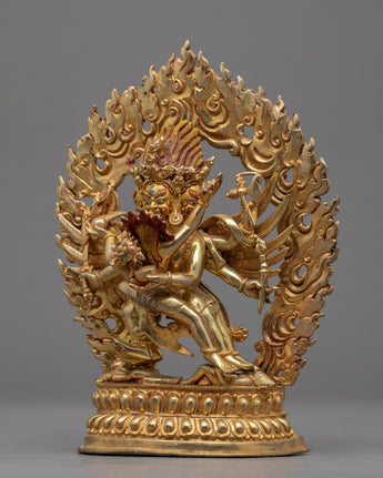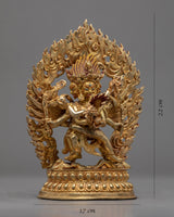 We have exclusively hand-carved the sculpture of Hayagriva Avatar in the traditional Himalayan Art of Nepal. Here in the statue, the deity is depicted standing on the lotus throne with 3 faces, 6 hands, and 4 legs. He holds his consort, Vajravarahi, in a passionate embrace. This union signifies the ideal harmony between knowledge and sympathy. They also each possess skull bowls overflowing with the blood of the four maras, representing their enlightened knowledge and triumph over death's powers. The five aggregates are purified by their human skull-adorned crowns, while Krodishvari's lengthy chain purifies the inner winds of skulls. It took us months and months of hard work to complete the statue. The process includes molding the figurine using copper and gilding with genuine 24K gold. The design patterns are hand-carved using a chisel and hammer.