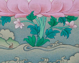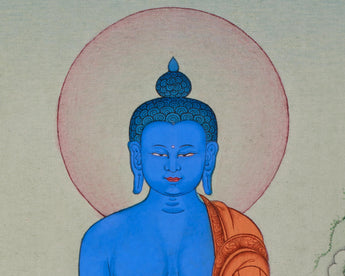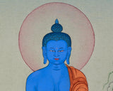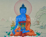 Bhaisajyaguru, the Buddha of healing and medicine, with a serene expression. His right hand holds a healing plant, symbolizing his ability to cure illness and promote wellness. His left hand often holds a medicinal bowl, symbolizing the healing elixirs he offers. His posture radiates peace, reminding viewers of the importance of healing both body and mind. This Medicine Buddha thangka is a powerful spiritual tool for invoking health, wellness, and compassion, making it perfect for meditation spaces or healing environments.