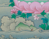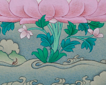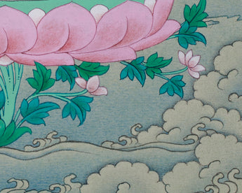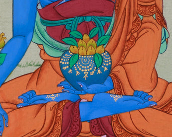 The Healing Buddha Bhaisajyaguru, holds a cherished place in the hearts of both Tibetan Buddhists and practitioners of traditional healing. It is a hand-painted thangka in the traditional Karma Gadri style, embodying the healing presence of the Medicine Buddha. The thangka is carefully painted using natural stone colors, which impart a rich and earthy tone that reflects its authenticity and spiritual depth. Genuine 24K gold accents are applied to emphasize the sacred details, such as the figure’s robes, aura, and healing tools. This enhances the thangka’s divine energy and beauty.